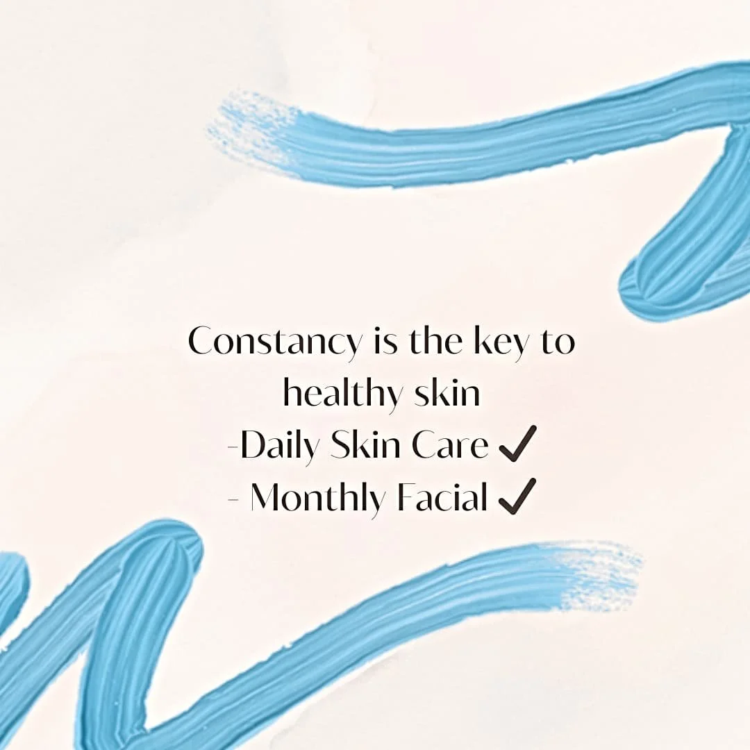 Inspirational quote about skin care surrounded by blue brush strokes on a white background.
