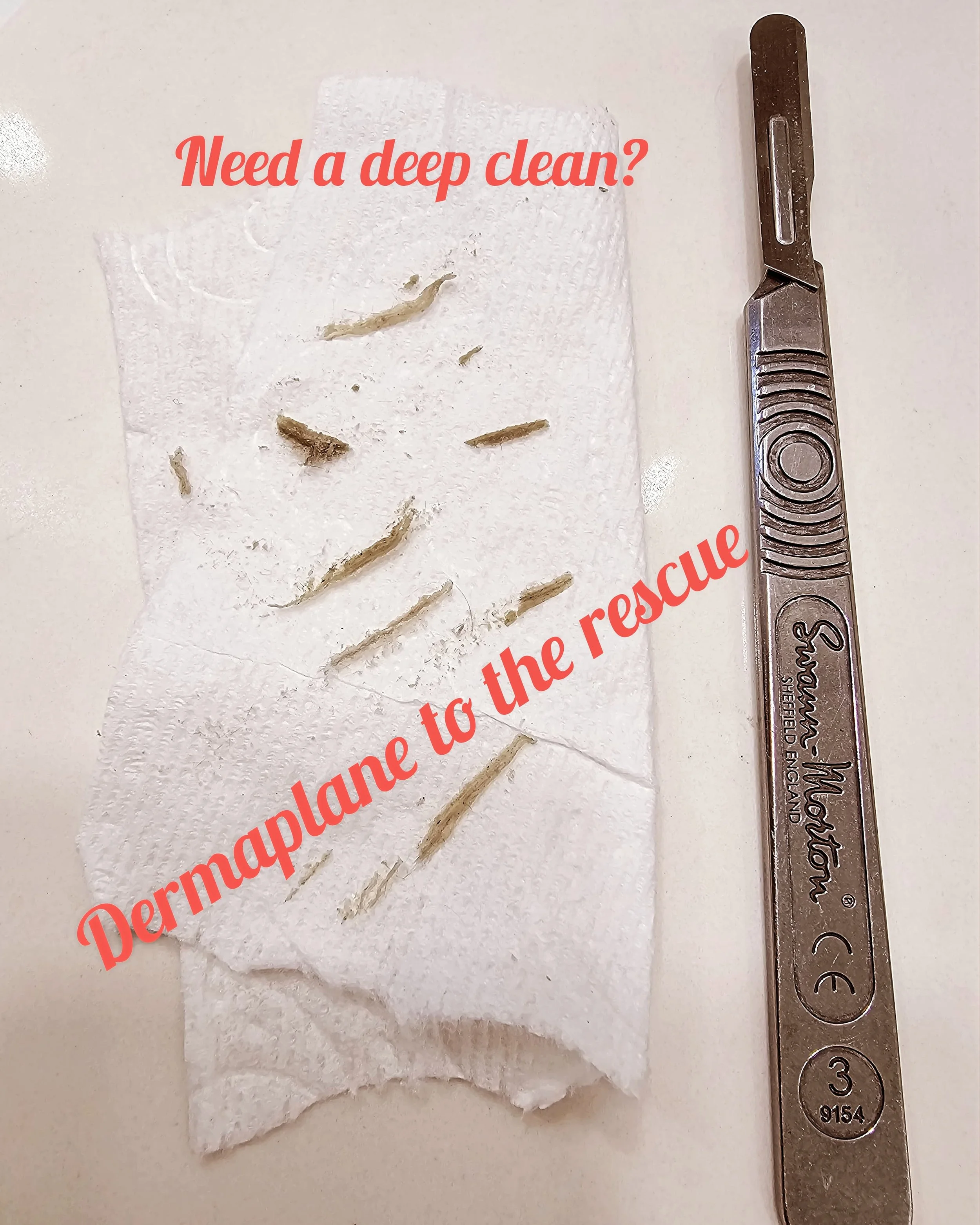Used tissue with hair in it next to a surgical scalpel on a white surface, with red text that reads 'Need a deep clean? Dermaplane to the rescue'.