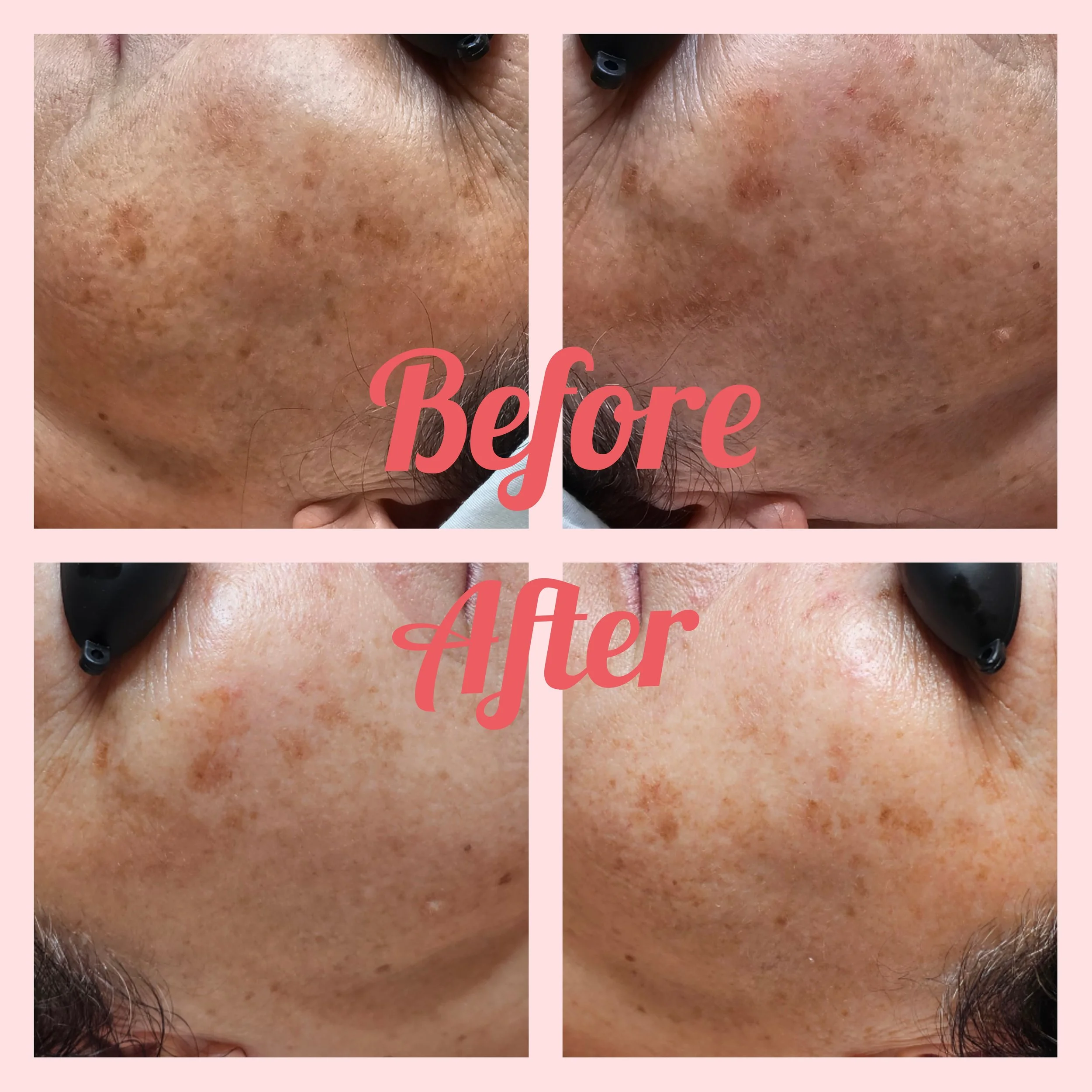 Before and after images showing a person's cheek with dark spots and hyperpigmentation. The after image shows a significant reduction in dark spots, revealing clearer skin.