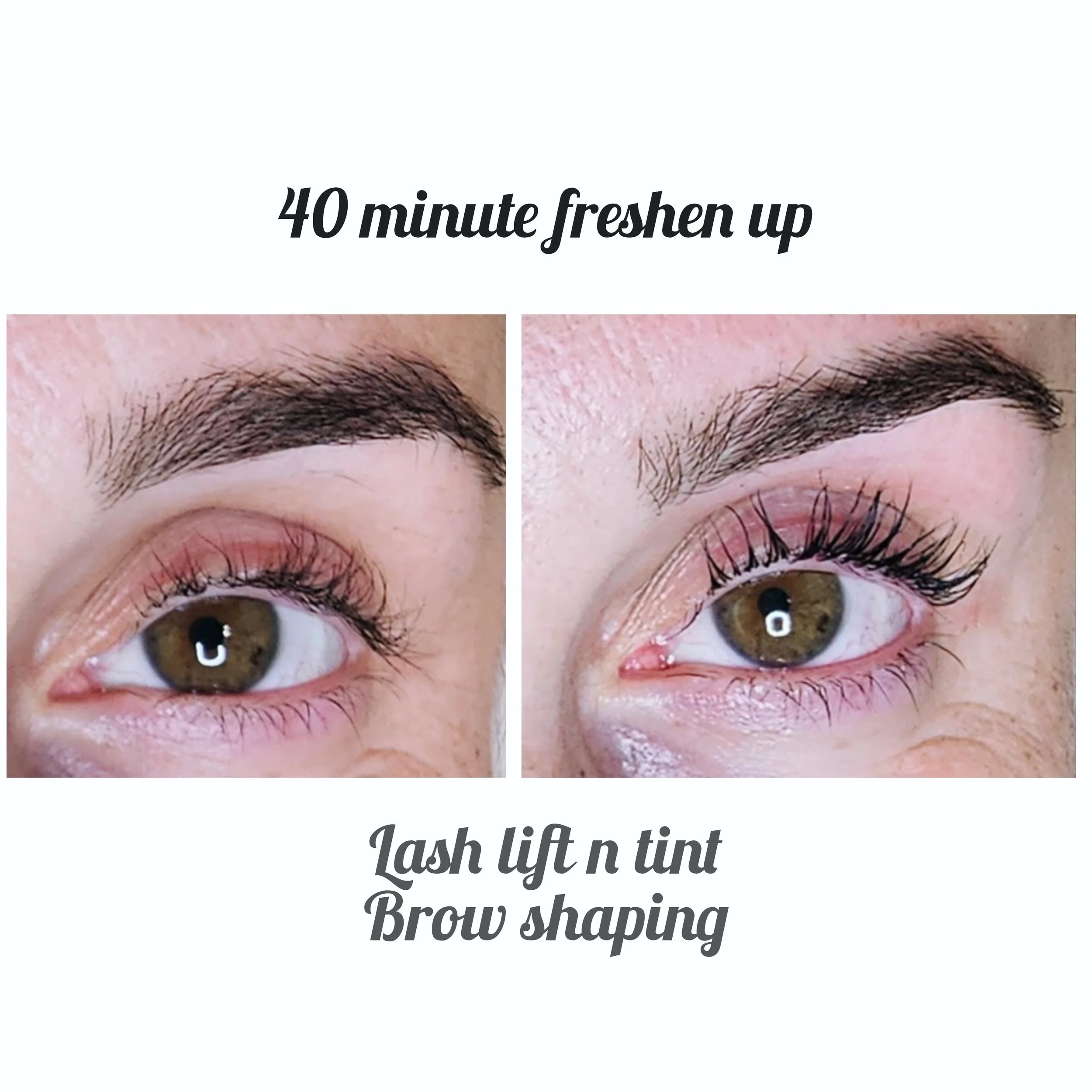 Comparison of before and after eyelash lift and tint, showing enhanced curl and definition. The left side depicts natural lashes, while the right side shows lifted, darker, and more curled eyelashes.