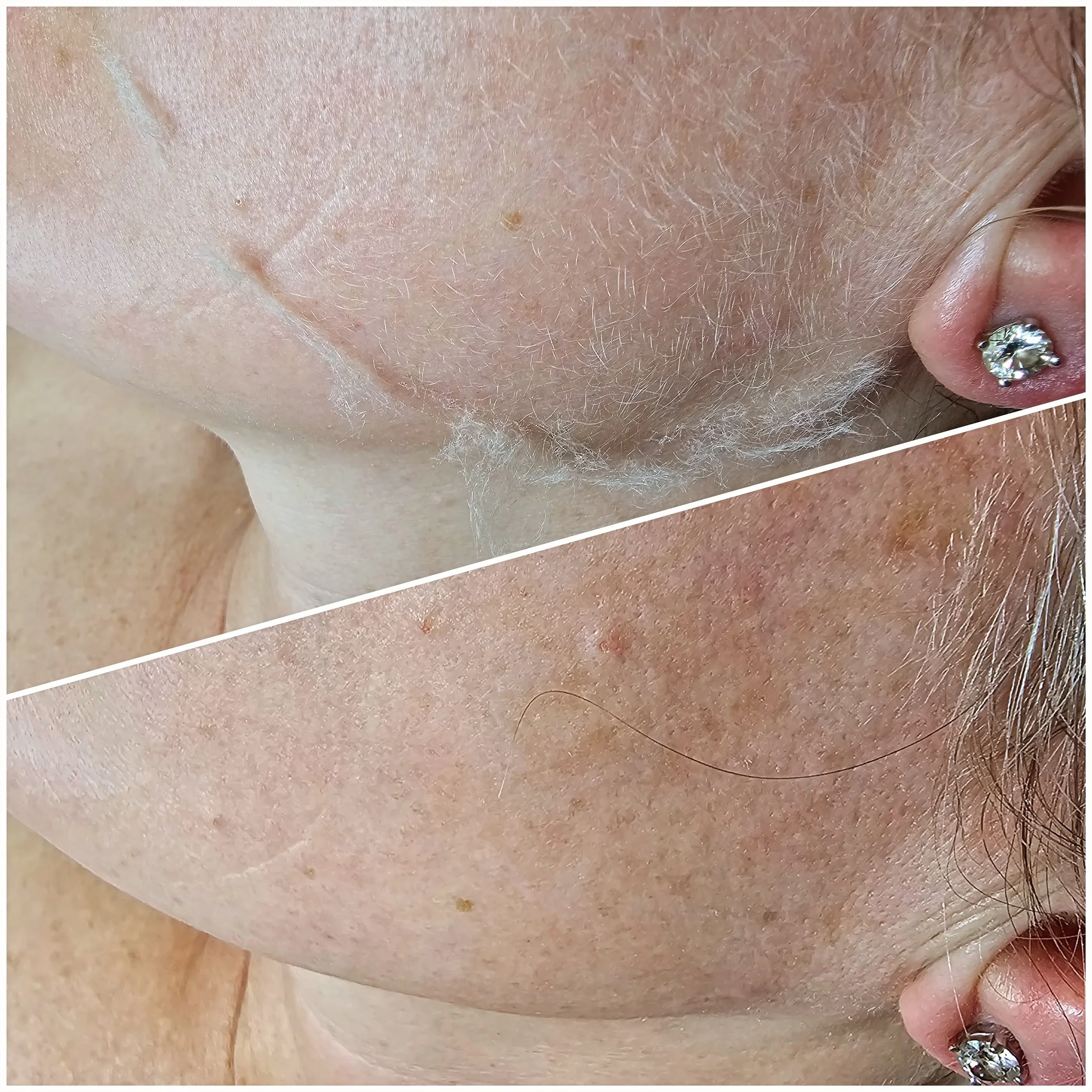 Close-up of facial skin showing before and after results of Dermaplane Enzyme Peel MicroCurrent Gua Sha treatment, highlighting improved skin texture and clarity.